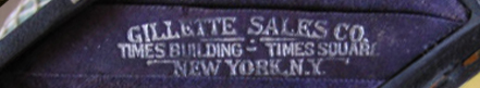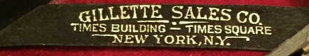 - "GILLETTE SALES CO. TIMES BLDG. N.Y." with ornamental design. Shown on catalog and adverts from 1905.