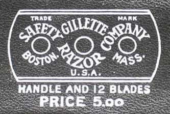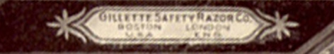 - "GILLE SAFETY RAZOR CO. BOSTON USA LONDON ENG" with ornamental design. Shown on 1906 catalog.