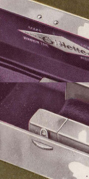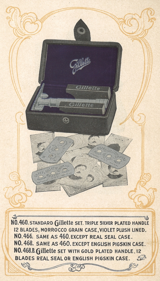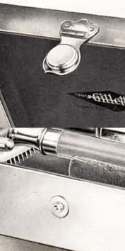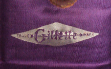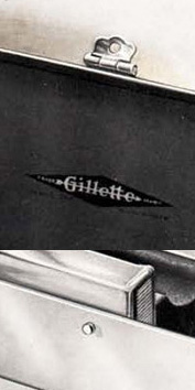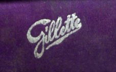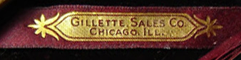 2. - "Gillette" script logo with silver or gold letters over satin lined of varied colors, sometimes on leather. Between 1906 and 1908.