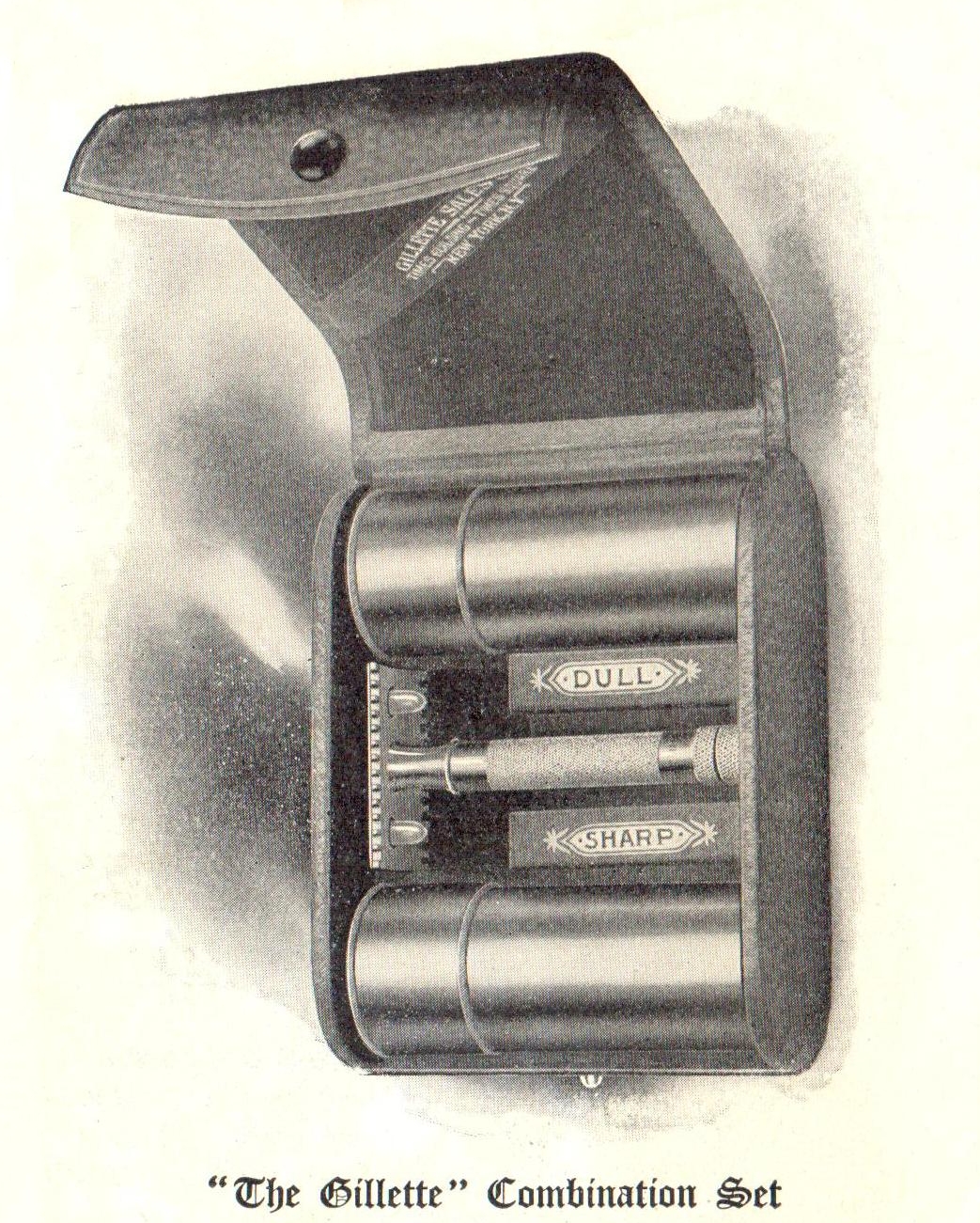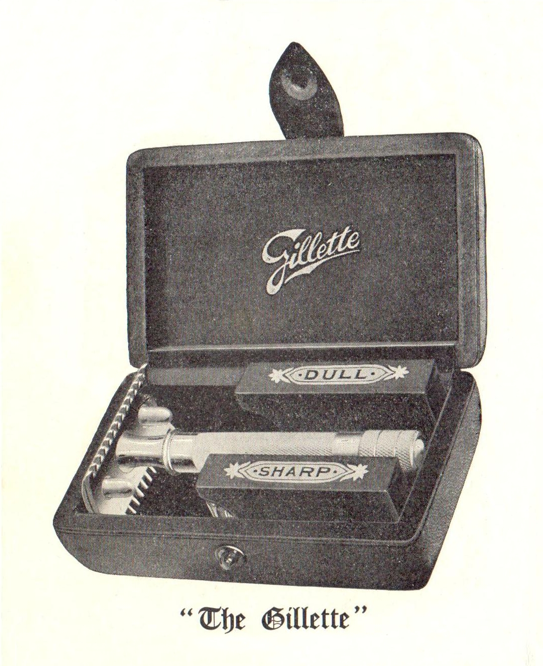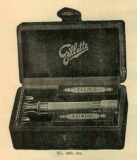 At the begining the legend on the cardboard blade boxes is "sharp" and "dull", but in some adverts between 1908 and 1919 has been found the legend "Gillette" on both boxes, with the same ornamental pattern as 1906 ones, or just the "Gillette" name without ornamental lines.